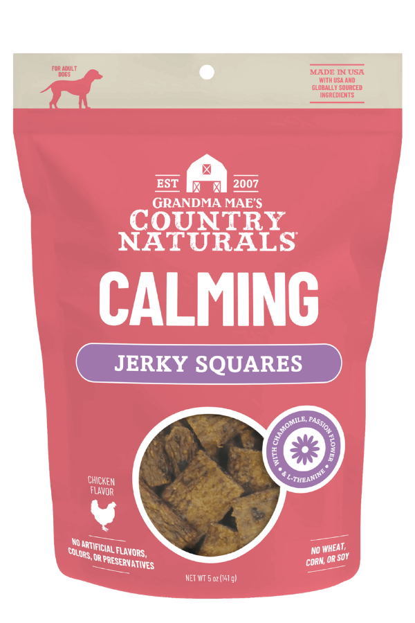 Help your dog relax naturally with Grandma Mae’s Country Naturals Calming Jerky Squares Dog Treats. These soft, chewy squares are formulated with calming chamomile, passion flower, and L‑theanine to help support relaxation during stressful situations such as travel, storms, or changes in routine.
